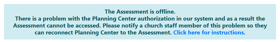 First, click the red button to deauthorize the connection. When it turns blue (and says Authorize PCO), click the button and follow the steps to authorize (this involves logging into Planning Center through the popup screen). Once connected, navigate to your test link. You should see the login form instead of the error message noted above.